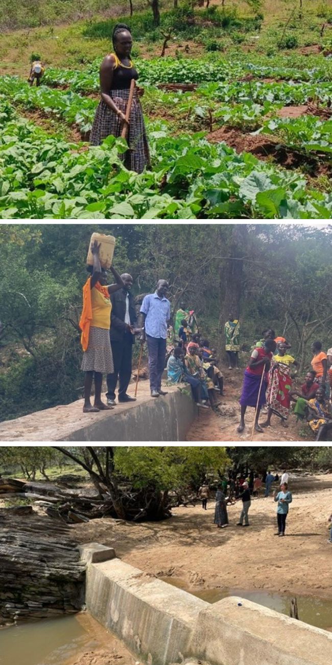 Top: Vivian in the vegetable garden Middle: Susan on new sand dam with jerrican Bottom: Established sand dam from behind