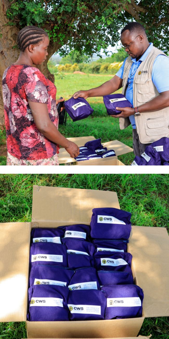 CWS staff distribute menstrual hygiene products to individuals in Nakivale refugee settlement in Uganda